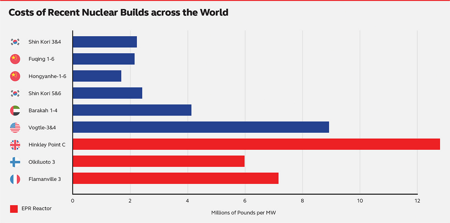 Unfortunately for enthusiasts, the UK’s attempt at a nuclear renaissance has been pretty shambolic so far. Hinkley Point C, which is currently under construction, is set to be the most expensive power station built anywhere in the world ever. The project is running 16 years behind schedule and about £17 billion over budget. Sizewell C, despite being built with an identical design, is set to be even more expensive to construct, though since it has a cost-plus contract, and is 45 percent government owned and funded, it may spend less on interest payments than Hinkley, where the private sector took on all the risk and debt.