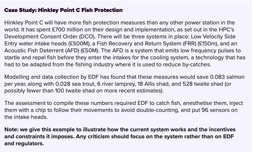 The most notorious example is the hundreds of millions of pounds that EDF had to spend on fish protection, in case fish entered the intake vents for the plant’s cooling system. This included a system to retrieve and return fish and an acoustic fish deterrent that would blare out low frequency pulses to scare the fish away. Despite EDF appealing the latter on the grounds that there was no danger to any protected species of fish, a government inspector demanded that EDF press ahead on the grounds “it cannot be concluded that there would not be adverse effects”. In other words, the developer had failed to prove a negative.