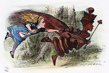 "A slow sort of country!" said the Queen. "Now, here, you see, it takes all the running you can do, to keep in the same place. If you want to get somewhere else, you must run at least twice as fast as that!"