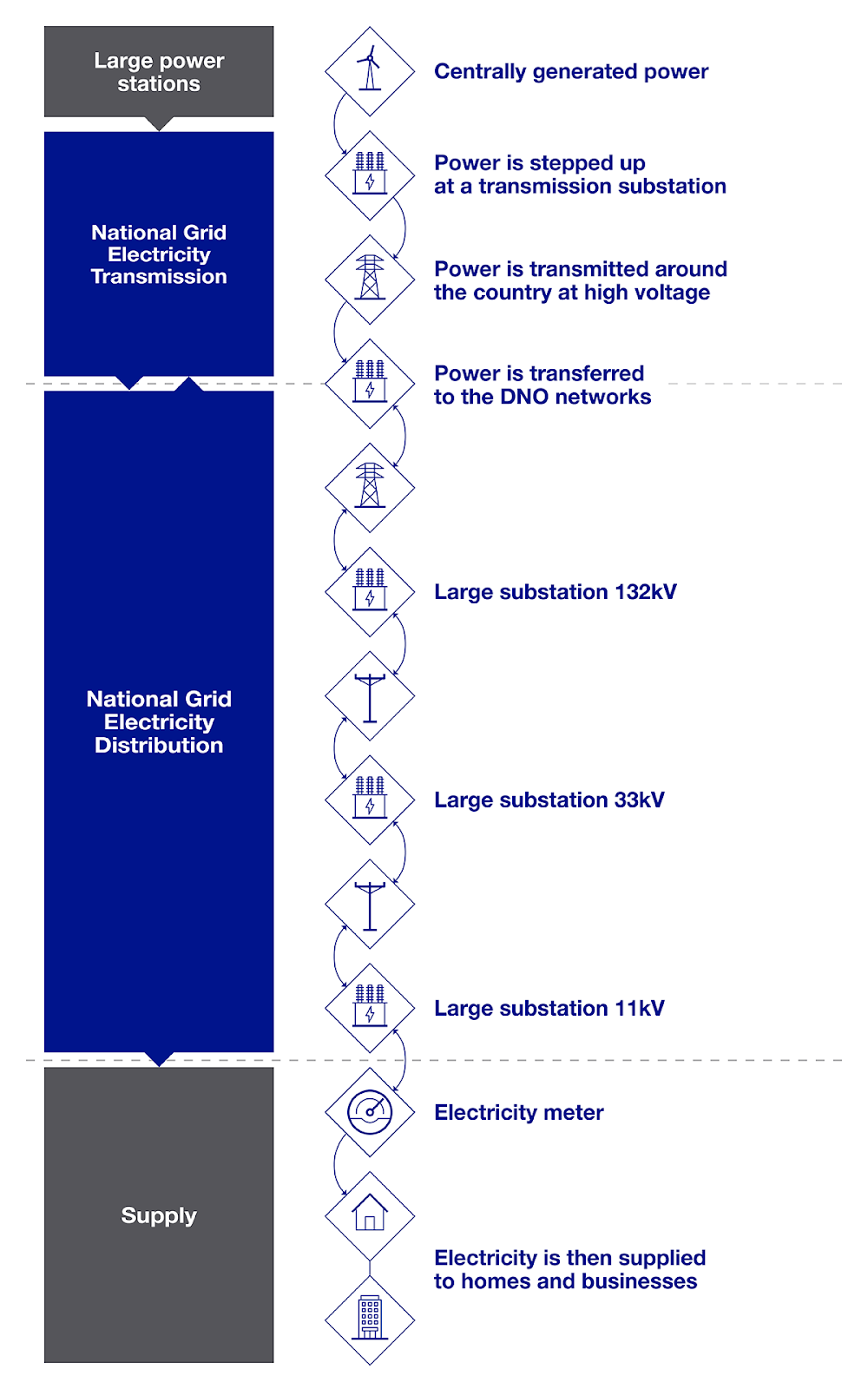 Sitting below the high-voltage transmission network are distribution networks, which carry electricity at lower voltages into towns, businesses, and homes. These are controlled by a mixture of privately-owned distribution network operators (DNOs) that act as regional monopolies, and newer independent operators (iDNOS) that build local distribution networks for specific developments.